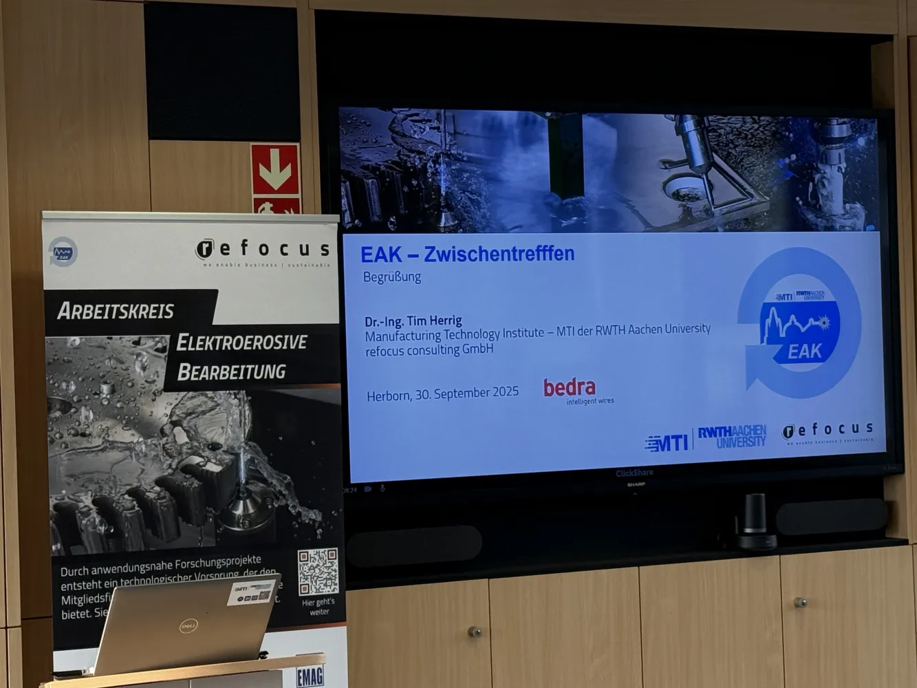 Letzte Woche fand das Zwischentreffen des Arbeitskreises Elektroerosive Bearbeitung (EAK) der refocus consulting GmbH in Zusammenarbeit mit dem Manufacturing Technology Institute – MTI der RWTH Aachen in Herborn bei der Berkenhoff GmbH (bedra) statt.